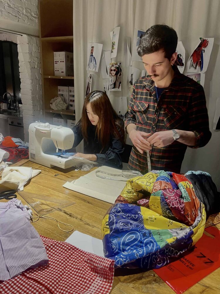 Lecturer Merve Kahveci working on her shorts design created by the wasted material and threads Atölye çalışması, eğitmenimiz Merve Kahveci'nin moda dünyasının geleceğinde sürdürülebilirliğin önemini anlatması ve eski malzemeyi kullanmanın yaratıcı yollarını tanıtmasıyla başladı. Daha sonra her öğrenciye eski tişörtler ve kumaş artıkları hediye edildi. Gerisi onların hayal gücüne bırakıldı! Birkaç dakika içinde geleceğin tüm tasarımcıları yaratıcı bir bölgedeydi ve dönüşüm başladı. Bir dakika içinde bitmiş gibi hissettiren bir atölye çalışmasının sonunda öğrenciler gurur verici tasarımlarını sergilediler: Temelde ise atık malzemelerden yapılan, türünün tek örneği çantalar ve şortlar! Atölye, sadece geri dönüşümün ve ileri dönüşümün önemini vurgulamakla kalmadı, aynı zamanda bize “sürdürülebilir yaratıcılığın asla modasının geçmediğini” hatırlattı.
