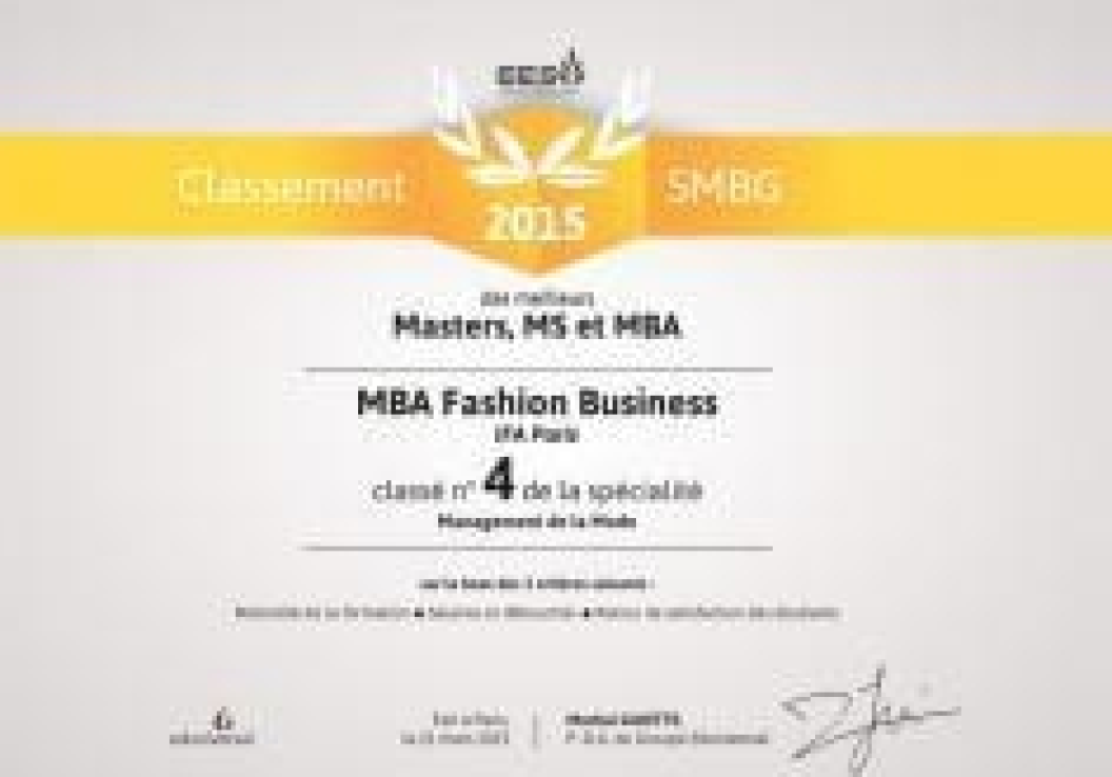 IFA Paris’in MBA Moda İşletmesi 3 yıldız aldı ve 4. sıraya yerleşti. Bu teşvik edici sonuç, moda profesyonelleri tarafından moda ve tasarım konusundaki güncel vizyonu ile Fransa ve yurt dışında en iyilerden biri olarak onaylanmış olan kapsamlı eğitiminin bir sonucu. MBA Moda İşletmesi IFA Paris’in felsefesi olan « Uluslar Arası Uzman » onayı üç sütun üzerine kurulu: yaratıcı bir atölye ve tasarım üzerine çevre ile bütün bir birleşim – bir moda koleksiyonunun pazara kadar gelişimi; Paris’te ve yurt dışında kurulmuş IFA Paris kampusları sayesinde küresel ve kültürler arası deneysellik; ve her öğrencinin potansiyel yeteneklerinin, kendi kişiliğini güçlendirecek benzersiz birer proje ile geliştirilmesi.